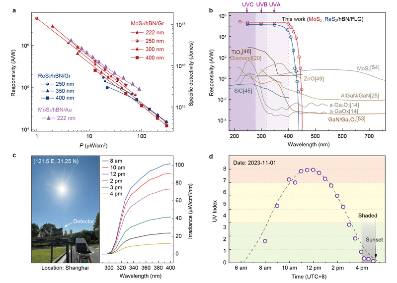 图1. (a)势垒调控的紫外光探测器响应率、探测率与入射光强的关系;(b)与宽带隙半导体紫外光电探测器的性能参数对比;(c)不同时刻的日照紫外光谱测量结果;(d)测得的紫外指数数值与气象数据(虚线)对比