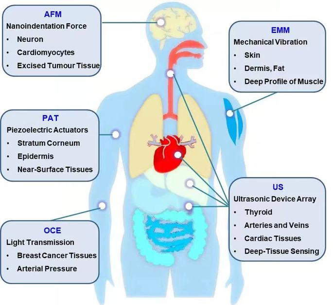 本图对近年来新兴的可用于生物组织力学性能表征的微系统技术的关键特征进行了概述,展示了包括原子力显微镜(AFM)/微悬臂探针技术、压电致动器/传感器技术(PAT)、机械振动(EMM)传感器、光学相干弹性成像技术(OCE)和超声检测方案(US)在内的不同技术在实际表征应用中可适用的组织部位。