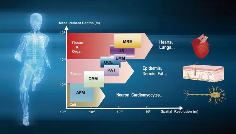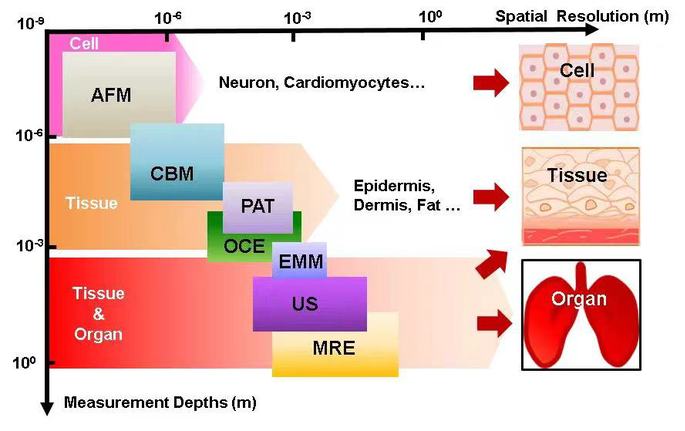 本图总结了包括原子力显微镜(AFM)、微悬臂探针(CBM)、压电驱动传感技术(PAT)、光学相干弹性成像(OCE)、机电模量(EMM)传感、超声(US)传感和磁共振弹性成像(MRE)在内的各种不同类型的组织模量评估方法的探测深度、时空分辨率和应用范围。