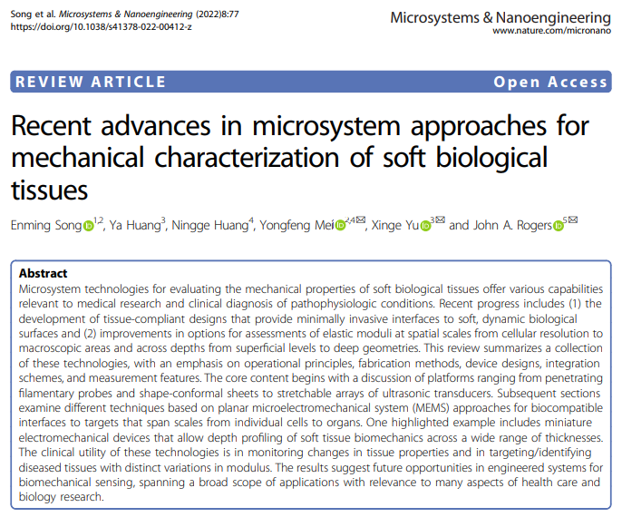 用于评估动物/人体组织力学特性的微机电系统可以为医学研究和临床诊断提供强大的助力,是极具前景的发展方向。赢乐67宋恩名青年研究员团队,联合美国西北大学John A. Rogers教授、香港城市大学于欣格教授、复旦大学梅永丰教授针对目前发展卓有成果的各种软组织机械性能表征技术进行了总结,重点比较了不同表征技术之间的结构设计、工作原理和测量参数,介绍了这些技术在临床中的相关应用,如监测软组织机械性能的变化、识别具有显著模量变化的病变组织等用。文章进一步讨论了若干基于平面微电子机械系统(MEMS)方式的技术。利用这些技术所制备的生物可兼容性接口,可以检测从单细胞量级至器官量级的目标。相关的微机电器件和检测方法可以应用于生物力学传感、卫生保健和生物学研究等许多方面。