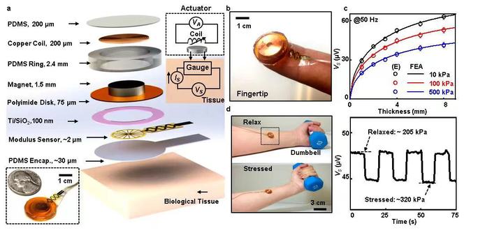 (a) 微型MEMS传感器件的部件分解图。该杨氏模量传感器集成了振动致动器、薄膜功能应力探测器等关键部件,通过应变片向底层组织传递周期性压力,进一步测量产生的位移和振幅。右上方插图为器件内部的工作电路示意图,左下方插图为器件背面照片。(b) MEMS器件测量指尖处皮肤的力学特性。(c) 杨氏模量传感器输出电压随不同模量样品的厚度变化的实验结果和仿真结果。(d)人体组织模量的动态测量结果。左图为人左前臂举起哑铃前(上)和举起哑铃时(下)的照片。右图为测试过程中传感器电压随时间发生的动态实测输出电压曲线。
