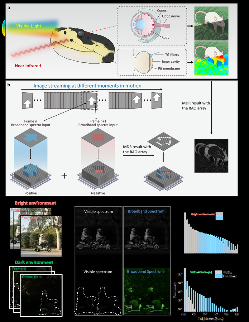 图. 受蛇视觉系统的启发,论文作者在复旦大学骑电动车实现的全天候运动探测