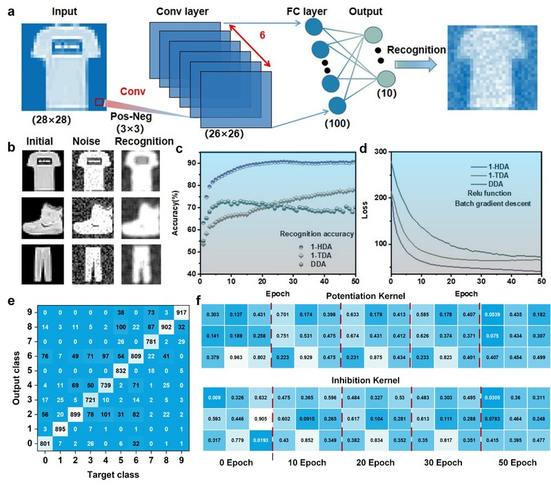 为了证明器件在存内计算中的潜力,作为概念验证,模拟了一个多层卷积神经网络,用于识别具有噪声的时装图像。该系统包含具有3×3卷积矩阵的卷积层和具有100个输入神经元和10个输出神经元的全连接层(图4a)。图4b为衬衫、鞋子和裤子在初始图像、噪声添加和识别状态下图像。如图4b所示,尽管对图像应用了额外的噪声像素点,但器件构建的CNN系统仍然能够准确识别服装的类型和风格。图4c示出了基于DDA、1-TDA和1-HDA器件的卷积神经网络在训练时期的识别精度,最终精度分别达到70.2%、78.3%和90.3%,表明器件的线性和中心对称双向权重更新能够实现更高的识别精度。图4d表明随着训练次数的增加,损失逐渐减少并最终收敛,说明训练的有效性。图4e进一步展示了基于1-HDA 器件构建的CNN在50个时期训练后测量的10类服装的分类结果的混淆矩阵。图4f分别示出了0、10、20、30和50个时期下的增强和抑制的卷积核。