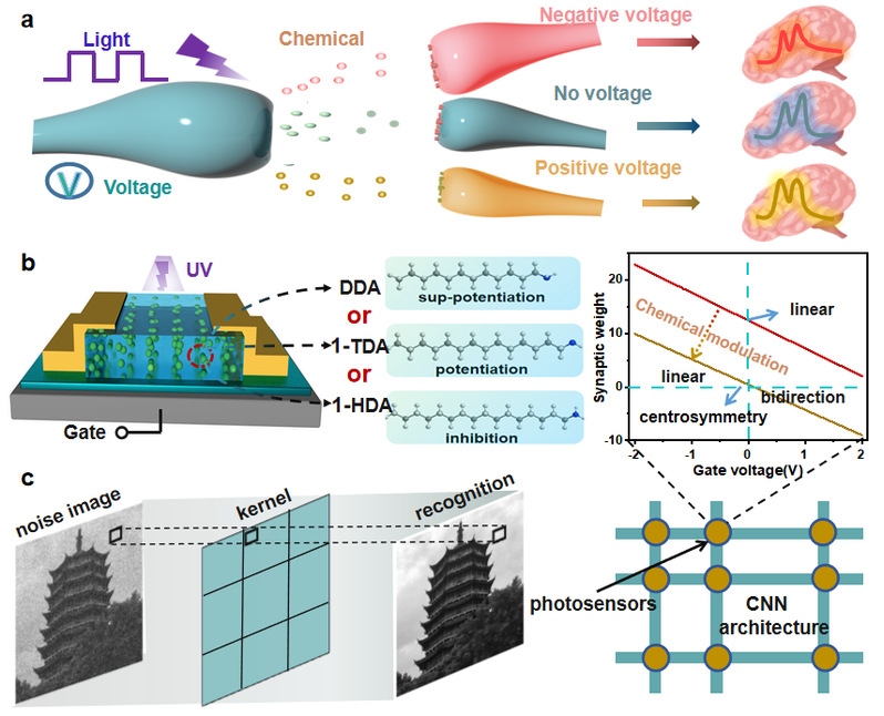 图1. (a)视觉系统中光、电、化学信号的多因子调制示意图。(b)器件的多因子调节表明器件的突触权重可以通过光、栅极电压和配体的链长来调节。(c)利用突触器件作为卷积核实现噪声图像识别的CNN系统的示意图。