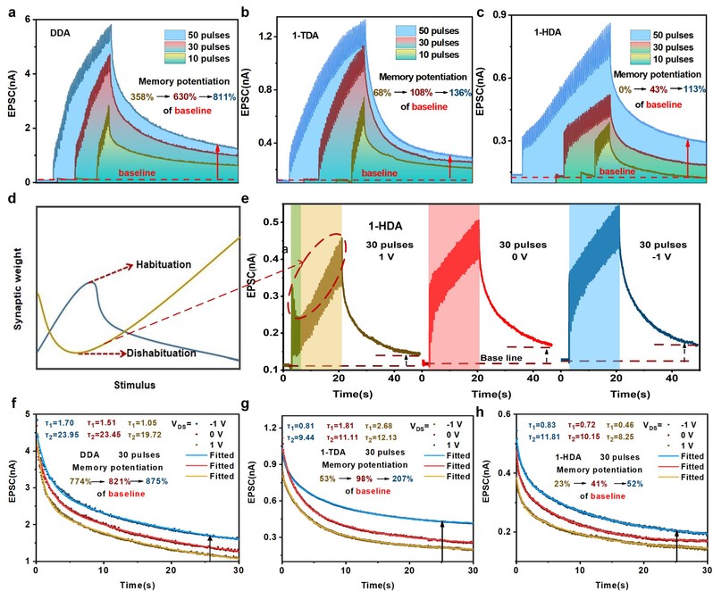 图3. (a-c)混合DDA、1-TDA和1-HAD量子点的器件在10、30和50脉冲数下的实时突触响应。(d)神经科学中习惯化和去习惯化行为的示意图。(e)不同栅极电压下混合DDA量子点的器件的突触响应。