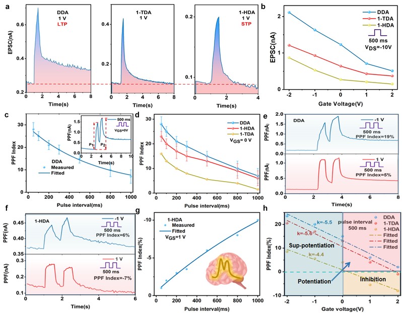 如图2a所示,突触电流的衰减速度取决于量子点配体链的长度,其中,链长较短的短链器件(DDA)的光电流下降缓慢,无法恢复到初始状态表现为长期可塑性。而当混合具有长链的1-HDA量子点时,沟道电流迅速降低到其初始状态,对应于短期塑性。此外,不仅量子点的链长可以调节突触可塑性,栅极电压也在突触可塑性的调节中起着重要作用。图2b-2h展示了混合不同配体链长的量子点的晶体管在不同栅极电压下的突触响应,器件的PPF响应在-1 V的负栅极电压下增强,而在1 V的正栅极电压下被抑制。最重要的是,量子点的末端配体的链长对器件的PPF响应有很大影响。如图2f所示,当栅极电压从-1 V切换到1 V时,与1-HDA量子点混合的器件的PPF响应从增强变为抑制,表现出独特的光抑制现象。如图2g所示,PPF响应可以分为三个部分。当施加连续的负栅极电压时,PPF增强,这被定义为超增强。而在正栅极电压下出现了一种光抑制的现象,并且这种抑制现象只出现在正栅压下的长链修饰器件和正栅压较大的短链修饰器件中。此外,器件的PPF指数与栅极电压的变化呈线性关系,,特别是对于掺有1-HDA量子点的器件,在正负栅极电压下的PPF响应表现出几乎线性和中心对称的变化。