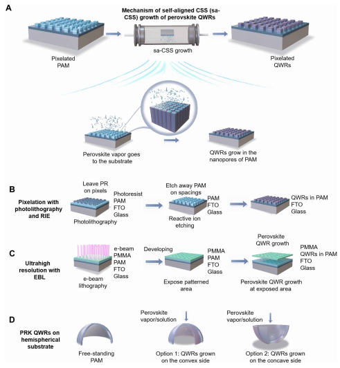 图1. 钙钛矿量子线的自对准约束空间合成生长机制及不同像素化工艺流程。(A)自对准约束空间合成方法机理示意图。图案化阳极氧化膜(PAM)可实现特定区域的自对准生长。(B)采用光刻与反应离子刻蚀(RIE)的像素化工艺流程示意图。(C)采用电子束光刻(EBL)实现超高分辨率的像素化工艺流程示意图。图中将聚甲基丙烯酸甲酯(PMMA)层抬起以显示PAM中的量子线(QWRs),但实验过程中未必需要去除该层。(D)非平面(如半球形)基底上钙钛矿(PRK)量子线生长工艺流程示意图。量子线既可在凸面侧生长(方案1),也可在凹面侧生长(方案2)。