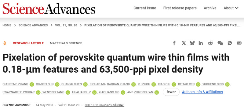 卤化物钙钛矿材料在广泛的光电应用中表现卓越,当前亟需开发基于钙钛矿的集成光电器件。然而,钙钛矿薄膜与湿法光刻工艺的不兼容性所导致的限制,严重阻碍了其在诸多重要应用领域的潜力,包括超高密度显示器、高分辨率图像传感器、高密度忆阻器以及集成光子电路。为攻克这一瓶颈问题,研究团队开发了钙钛矿量子线的自对准紧密间距升华生长技术,成功制备出特征尺寸为0.18微米的钙钛矿图案,同时实现了每英寸63,500像素的像素密度——这是目前钙钛矿材料报道中的最高值。该工作展示了钙钛矿量子线与色彩转换薄膜的像素化集成方案,解决了全彩色微显示器的需求。此外,研究团队还在曲面基底上验证了这些薄膜的性能,为近眼微显示器的发展提供了可能。该工作展示的工艺同样适用于其他钙钛矿器件,如高分辨率显示器、图像传感和忆阻器阵列。