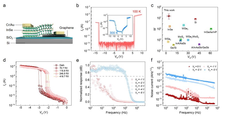 1 a. Graphene/InSe/Cr 肖特基结APD器件结构示意图;b. 器件在300K100K的双边雪崩击穿特性曲线;c. Graphene/InSe/Cr 肖特基结APD与传统半导体APD及其他二维材料APD的击穿电压(Vbd)与增益(M)关系对比;d. 300K520 nm激光波长,70.7fW418.7fW功率范围内暗态及光照下器件的I-V曲线;e. 520nm入射光波长下不同反向偏压Ia3dB带宽;f. 300K时器件在不同偏压下的噪声电流随频率变化曲线。