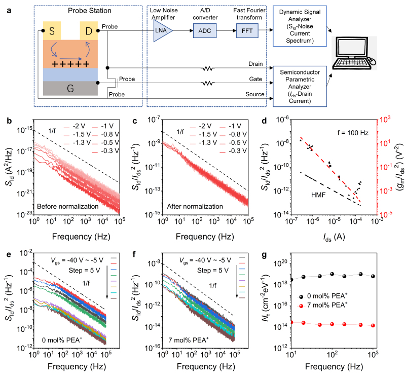 图4.(a)噪声测量装置示意图。(b)优化后的钙钛矿晶体管在不同漏极电压下的噪声功率谱密度。(c)电流归一化后的噪声功率谱密度。(d)f=100Hz时优化的钙钛矿晶体管SId/Ids2vsIds图。未处理(e)和优化后(f)钙钛矿晶体管在不同栅极电压下的归一化的噪声功率谱密度。(g)不同频率下未处理的钙钛矿晶体管和优化后的钙钛矿晶体管的缺陷态密度。