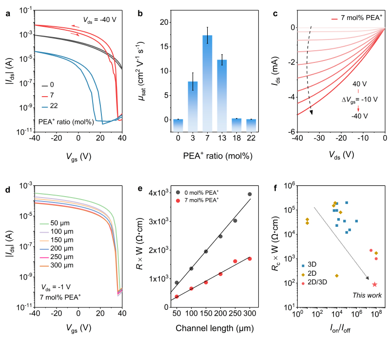 图2.(a)不同PEA+浓度下锡基钙钛矿晶体管的转移特性曲线。(b)10个不同PEA+浓度钙钛矿晶体管的迁移率统计。(c)7mol% PEA+的Sn钙钛矿晶体管输出曲线。(d)优化后的钙钛矿晶体管不同沟道长度在线性区的转移特性曲线。(e)原始和优化钙钛矿晶体管在不同沟道长度的TLM图。(f)Sn钙钛矿晶体管的接触电阻总结。