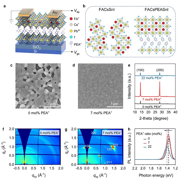 图1.(a)锡基钙钛矿型晶体管结构示意图。(b)PEA+诱导FA0.9Cs0.1SnI3钙钛矿晶体结构变化示意图。(c)未处理和优化后(d)锡基钙钛矿薄膜的SEM图像。(e)不同PEA+浓度下锡基钙钛矿膜的XRD衍射图谱。未处理(f)和优化后(g)锡基钙钛矿薄膜的GIWAXS散射图。(h)不同PEA+浓度下Sn基钙钛矿薄膜的稳态荧光图谱。