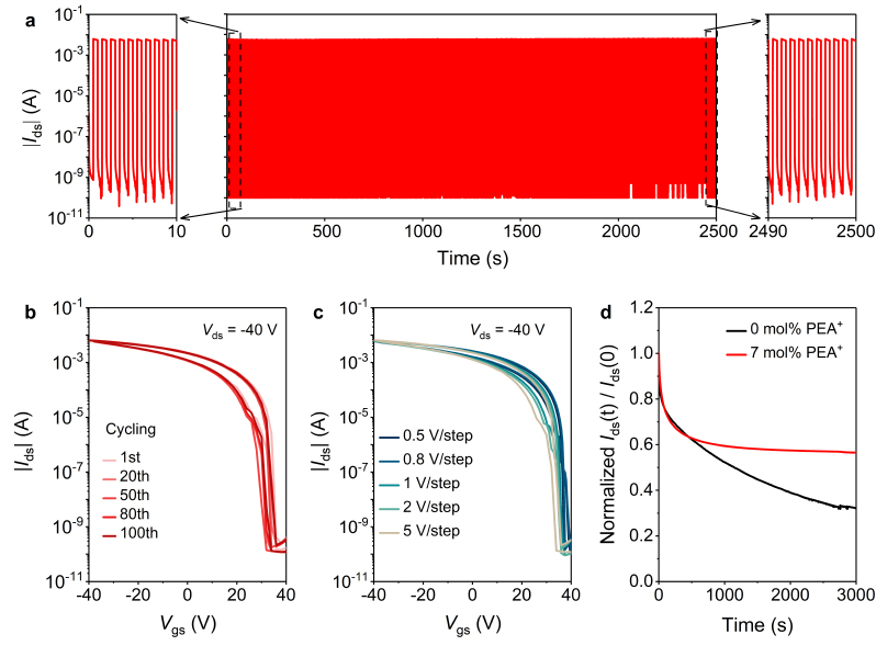 图3.(a)优化后钙钛矿晶体管的开/关循环测试。(b)最佳性能下的钙钛矿晶体管100次循环测量转移曲线。(c)优化后的钙钛矿晶体管在不同扫描步长的转移特性曲线。(d)原始和优化后的钙钛矿晶体管的负偏置应力稳定性。