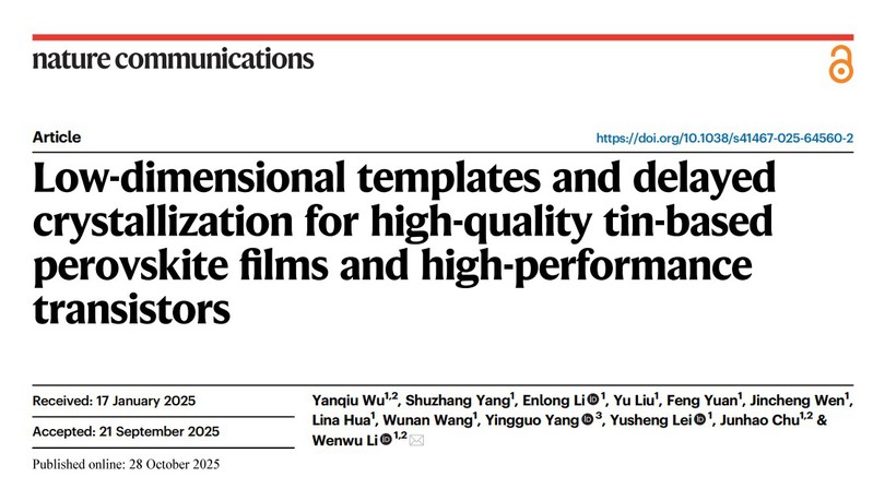 文章信息:Yanqiu Wu, Shuzhang Yang, Enlong Li, Yu Liu, Feng Yuan, Jincheng Wen, Lina Hua, Wunan Wang, Yingguo Yang, Yusheng Lei, Junhao Chu, Wenwu Li*,Low-dimensional templates and delayed crystallization for high-quality tin-based perovskite films and high-performance transistors. Nature Communications 16, 9505 (2025).
