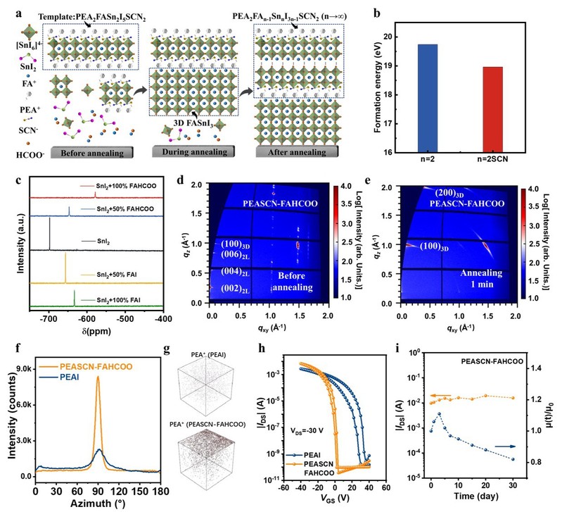 本研究针对准二维锡基钙钛矿薄膜制备中存在的相竞争生长、缺陷密度较高及取向不佳等问题,提出低维模板诱导与延迟结晶相结合的协同策略,有效改善了上述瓶颈,成功制备出高质量锡基钙钛矿薄膜。具体而言,通过在前驱体中引入PEASCN,优先形成热力学稳定的PEA2FAn-1SnnI3n-1SCN2n=2低维模板;同时以FAHCOONH4I替代FAI,抑制室温下3D FASnI3相的无序生长,实现延迟结晶控制。在后续退火过程中,低维模板可定向引导高维相生长,最终形成垂直取向性优异、缺陷密度显著降低的薄膜结构。制备的场效应晶体管展现出高达43cm2V-1s-1的迁移率和超过108的开关比,同时几乎无滞后现象且稳定性增强。这些结果展示了一种调节结晶动力学和实现高性能、稳定锡基钙钛矿的有效方法,为未来电子器件的应用提供了可靠的基础。