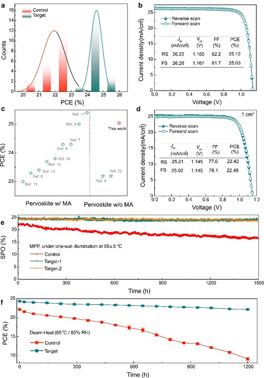 图2:反式无甲铵钙钛矿太阳电池的器件性能和稳定性