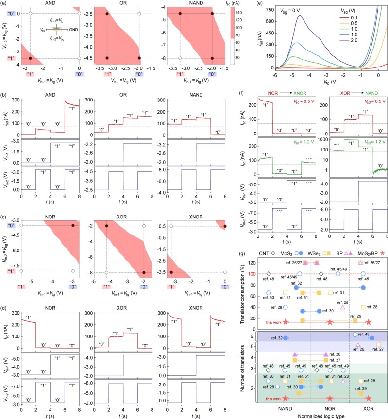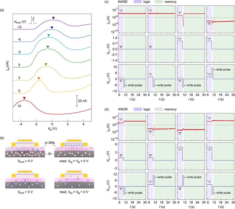 在上述基础上,该工作利用富硅氮化硅介电衬底的高电荷捕获特性,实现了布尔逻辑门的原位存储。在该衬底上,高斯晶体管的双栅调控电输运曲线表现出明显的非易失存储特性。该工作展示了高斯晶体管在可重构存内逻辑方面应用的可行性,为并行计算架构的硬件实现提供了新思路。