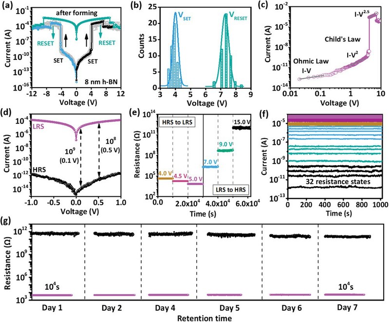 2. 石墨烯/α-ln2Se3/h-BN/金范德华异质结忆阻器的电学性能(其中,h-BN厚度为8nm)。(a)忆阻器的I-V曲线。(b) 写入SET和重置RESET电压统计分布。(c)对数-对数坐标I-V曲线。(d)高阻态HRS和低阻态LRSI-V曲线。(e)施加不同SETRESET电压后电阻态的保持曲线。(f)施加不同的电压脉冲所记录的32个电阻态。(g) HRSLRS状态下的保持稳定性。