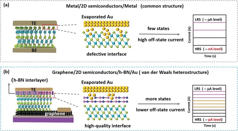 1. 传统结构和范德华异质结构忆阻器对比:a)传统金属/2D半导体/金属堆叠忆阻器,在二维半导体/顶电极之间存在缺陷的界面。(b)石墨烯/α-ln2Se3/h-BN/金范德华异质结构忆阻器,在二维半导体/h-BN之间存在高质量的界面。