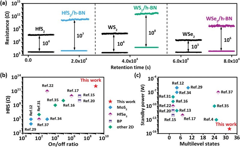 4.a)有无h-BN界面层的HfS2WS2WSe2忆阻器在HRSLRS状态下的保持性能。(bc)石墨烯/α-ln2Se3/h-BN/Cr-Au范德华忆阻器与最近报道的忆阻器性能参数比较。