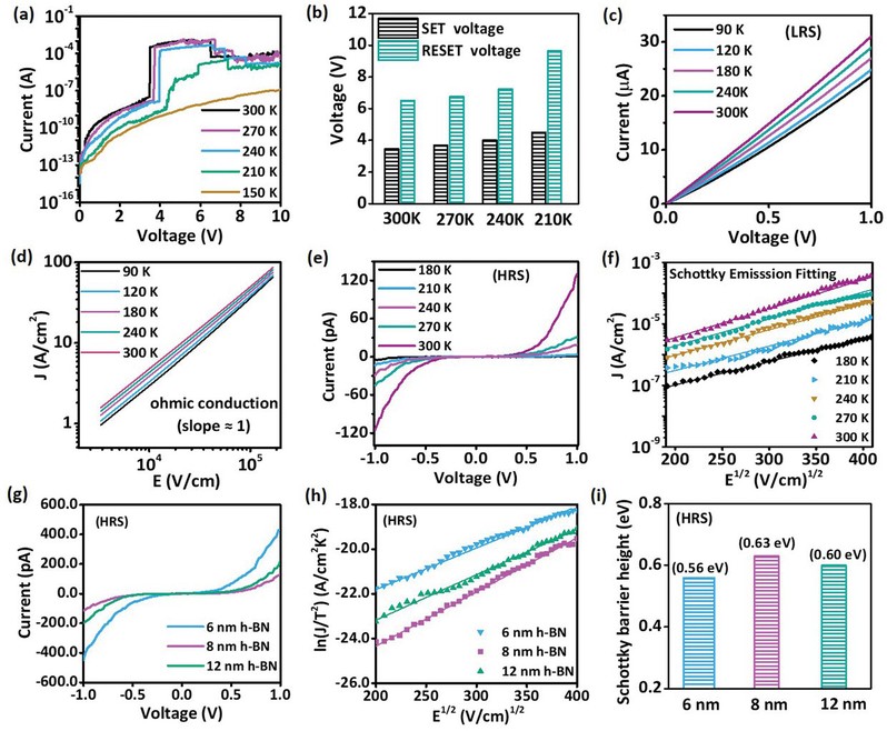 3. 温度依赖的I-V曲线及导电机制分析。(a)在不同温度下测量的I-V曲线。(b)不同温度下的SETRESET 电压(cLRS状态温度相关的I-V曲线。(d)欧姆传导拟合曲线。(eHRS状态温度相关的I-V曲线。(f)肖特基发射拟合曲线。(g)在相同复位电压和300 K条件下,具有不同h-BN层厚度的忆阻器的I-V曲线。(h)肖特基势垒高度拟合。(i)提取的肖特基势垒高度值。