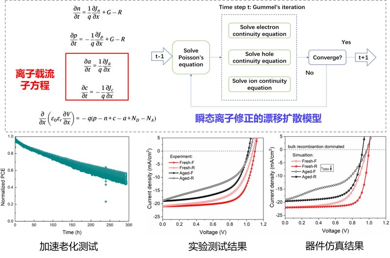 电流密度-电压 (J-V) 曲线的滞后行为由不断变化的离子感应电场与载流子传输/复合之间的相互作用控制,提供了有关器件物理特性的重要信息。为了深入理解钙钛矿太阳能电池的退化机制,张鸿研究员联合安徽大学黄志祥教授、香港大学蔡植豪教授以及香港城市大学叶轩立教授团队,开发了一种瞬态离子修正的扩散漂移模型。通过研究器件老化过程中的迟滞变化特征,建立了特征J-V迟滞特性与关键器件问题(如体相和表面缺陷及各层低迁移率)之间的关系,实现了对钙钛矿太阳能电池老化机制的实时在线分析。这项工作为揭示钙钛矿太阳能电池在连续运行期间的退化根源及其解决和优化方法提供了新思路。相关论文已在《Nature Communications》杂志上发表。