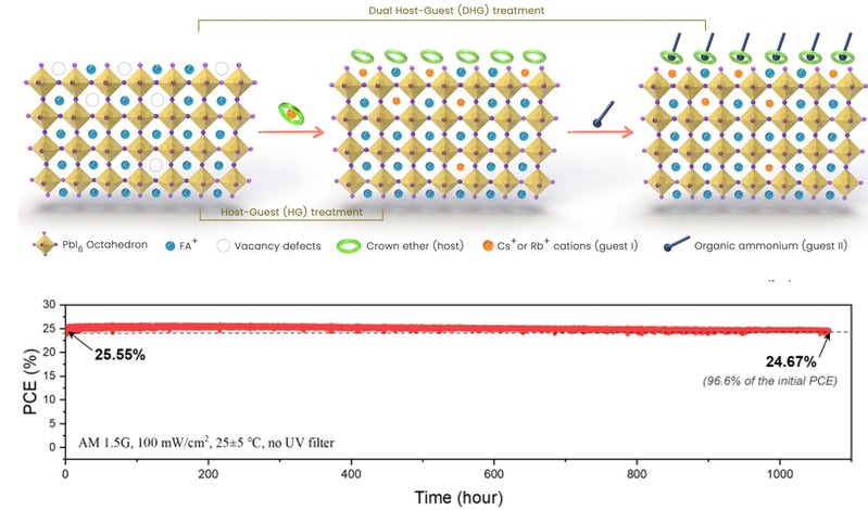 钙钛矿薄膜与载流子传输层界面缺陷是制约钙钛矿太阳能电池性能及稳定性提升的关键因素。为此,我院张鸿研究员联合华北电力大学姚建曦教授以及洛桑联邦理工学院Michael Graetzel教授团队,创新性地提出了一种通过双主客体络合策略来优化FAPbI3钙钛矿太阳能电池体相和界面特性的方法。采用二维固态核磁共振光谱、扫描隧道显微镜/光谱等多种先进表征技术证实,该策略不仅能够有效钝化钙钛矿薄膜表面及界面上的缺陷,还能显著增强界面处载流子的提取与传输效率。基于此方法制备出的钙钛矿太阳能电池达到了25.89%的光电转换效率(认证效率为25.53%)。此外,在模拟一个标准太阳光照条件下连续工作1050小时后,这款初始效率达到25.55%的高效钙钛矿太阳能电池仍能保持其原始效率的96.6%以上,实现了高效率与长期稳定性之间的良好平衡,这标志着首次成功实现了高效率钙钛矿太阳能电池“稳效协同”的目标。这项研究成果为利用超分子工程技术提高钙钛矿光伏电池的稳定性和效率提供了新思路,并代表了该领域内的一个重要突破。相关论文已在《Nature Communications》杂志上发表。