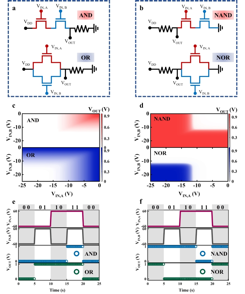 逻辑电路应用:通过器件的互连,硒牺牲层方法制备的ReS2场效应晶体管能够有效实现与门、或门、与非门、或非门的逻辑功能,展示其在集成电路的应用前景。