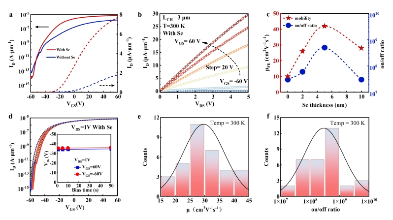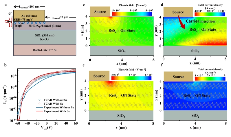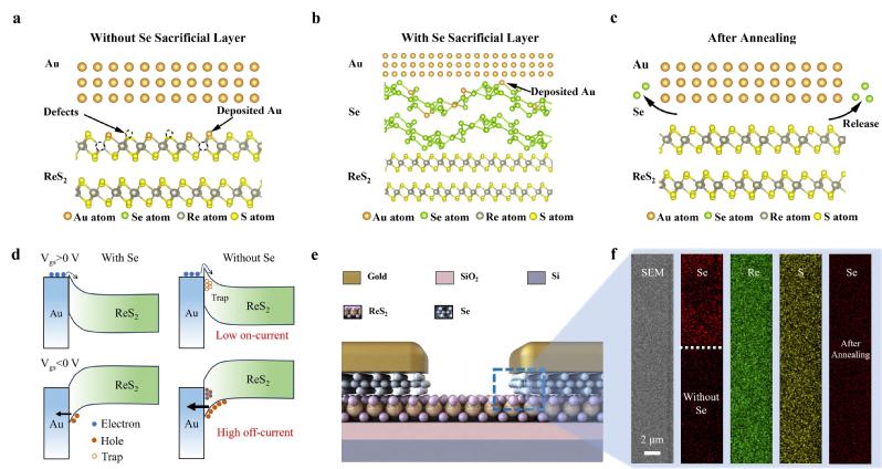 硒牺牲层接触调控机制:硒在10-6torr压力下的热蒸发沉积镀膜温度为125℃,这一温度不会破坏二维材料,因此在制备ReS2场效应晶体管的源漏电极之前,在电极接触位置先沉积一层硒牺牲层能够有效保护ReS2不受高能金属颗粒轰击破坏。此外,硒牺牲层能够在后续的退火工艺中被有效去除。硒牺牲层对ReS2的保护能够降低场效应晶体管电极触位置的肖特基势垒和缺陷态密度,从而增大场效应晶体管的开态电流,降低了关态电流。